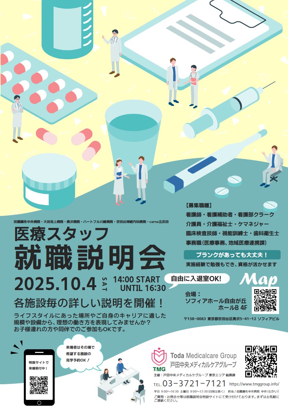 【2025.10.4開催】TMG東京エリア医療スタッフ就職説明会開催のお知らせ 投稿日 2025.9.25 カテゴリー 病院からのお知らせ 日時:2025年10月4日(土)14:00~16:30 職種:看護師、看護補助、コメディカル全般、事務職など 会場:自由が丘ソフィアホールB 4階 申込:不要 ※事前申込みもできます♪ *詳細はこちらをご覧ください* 皆様のお越しを心よりお待ちしております。ご質問等ございましたら、当院までお気軽にお電話ください☎